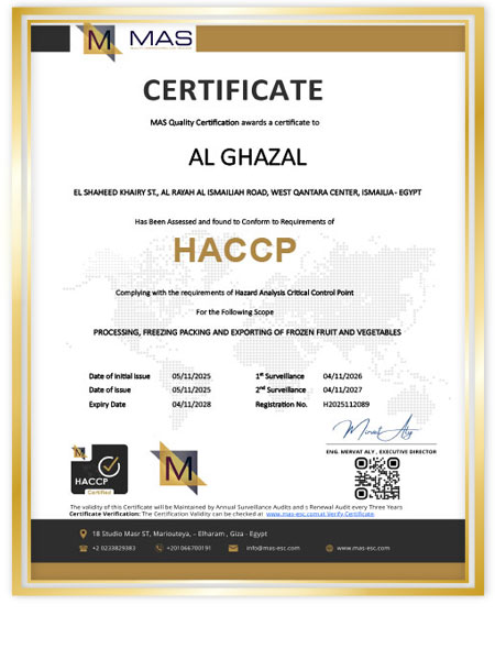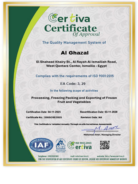 With privately owned farms and a fully integrated facility in Ismailia, the company maintains full control over every stage of production—from cultivation and harvesting, to processing and packing, and finally exporting to international markets. This success is driven by a highly experienced management and technical team, enabling Al Ghazal to build long-term partnerships based on trust, commitment, and consistent quality.